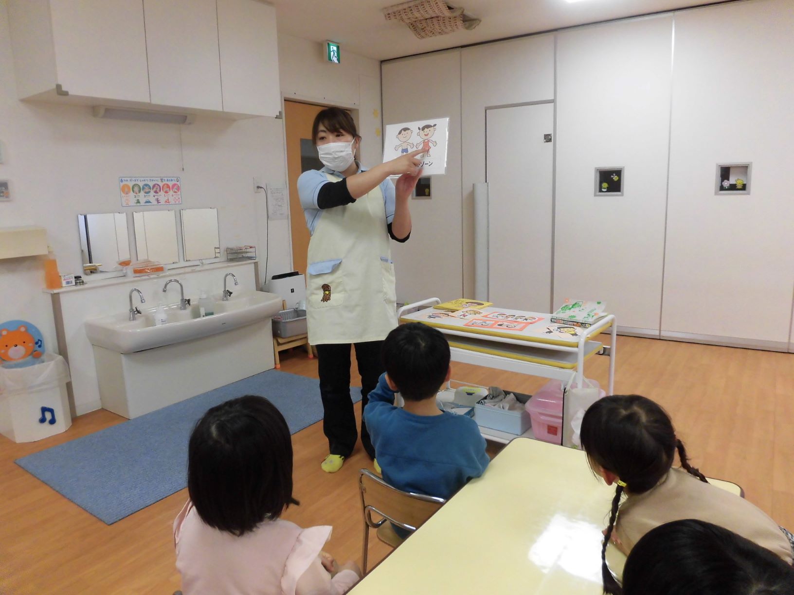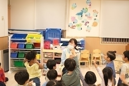 インストラクター(外部講師)による英語レッスンを定期的に実施。習った歌遊びや単語の発音を日々の保育に取り入れている園もございます。他にも、歌や手遊びをしたり、壁に英語のカードを貼ったりなど工夫を凝らして英語への興味を引き出しています。