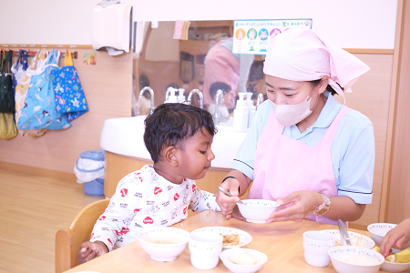 「おもいっきり給食は」、3大アレルギー食材(乳・卵・小麦)を使わず、「おいしい!」をみんなで分かち合う給食(お昼ご飯)となります。調理の過程を間近に見て、楽しく食べる体験を通して、食への関心を育みます。自分たちで野菜を育て、食べる活動にも取り組んでいます。