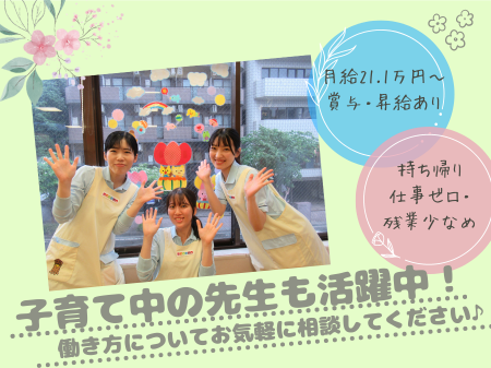 | 勤務時間 | 週3日以上/シフト制 ◆開園時間 月~金 7:30~20:00 土 7:30~18:30 ◆1日4.5時間程度 週3日~週5日勤務可能な方 ※シフト例 ・13:00~18:30 (休憩なし) ・15:00~19:00 (休憩なし) ・14:00~19:00 (休憩なし) 1ヶ月の労働時間:52~130時間/月 |