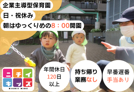 | 仕事内容 | □■ 0~2歳までの18名定員の企業主導型保育園における保育業務全般 □■ ◇子どもたちの年齢に合わせた保育計画をもとに、 日々の保育を実践します。 授乳やおむつ交換、着替え、食事の補助、リトミック、 行事企画、環境整備など。 子どもたちの年齢や成長に応じた保育業務全般を行っていただきます。 ◆ニチイの保育理念は「おもいっきり遊ぶ おもいっきり学ぶ」 英会話レッスン、リトミック教育、食育などを通じ、 子どもたちが様々なことに好奇心を持ち、遊びながら学べるような カリキュラムを取り入れています。 子どもたちも保育士も「おもいっきり」楽しめるような保育を一緒にしましょう! |