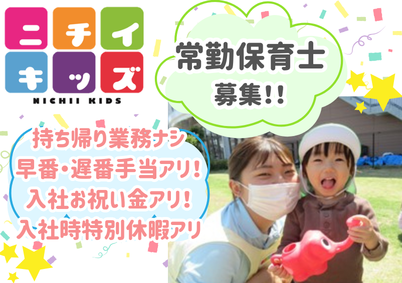 | 仕事内容 | □■ 0~2歳までの36名定員の企業主導型保育園における保育業務全般 □■ ◇子どもたちの年齢に合わせた保育計画をもとに、日々の保育を実践します。 授乳やおむつ交換、着替え、食事の補助、リトミック、教材検討、行事企画、環境整備など。 ◆ニチイの保育理念は「おもいっきり遊び、おもいっきり学ぶ」 英会話レッスン、リトミック教育、食育などを通じ、 子どもたちが様々なことに好奇心を持ち、遊びながら学べるような カリキュラムを取り入れています。 子どもたちも保育士も「おもいっきり」楽しめるような保育を一緒にしましょう! |