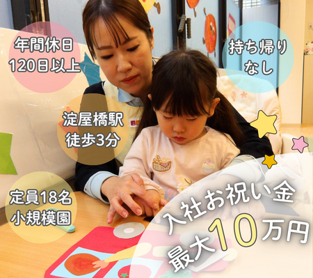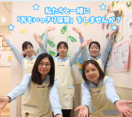 | 仕事内容 | 0~2歳児(定員18名)の保育業務を行っていただきます。 ◎着替え、食事の補助 ◎保育環境の整備(園内清掃等) ◎保護者対応(連絡帳の作成等) ◎制作物等の作成 ※未経験、ブランクがある方も丁寧に指導します。 ※持ち帰り仕事なし。 ※保育記録などはICTシステムを導入しており業務効率を図っています。 ※子育て世代の方が活躍できる職場です。 |