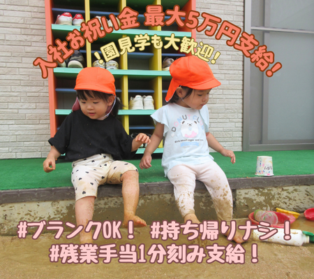 | 仕事内容 | 対象年齢:0歳児~5歳児 定員:25名 子どもの年齢や成長に応じた保育業務全般を行っていただきます。 ・着替え、食事の補助 ・保育環境の整備(活動の準備、清掃等) ・保護者対応(連絡帳の作成等) ・帳票作成(日誌、行事計画等) ・製作物等の作成 ※未経験、ブランクがある方も丁寧に研修します。 実際にブランクがある方も活躍しているので安心してください! ※持ち帰り仕事なし。 |