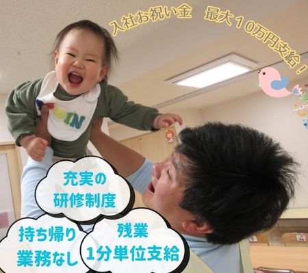 | 仕事内容 | 対象年齢0~2歳児 定員19名 子どもの年齢や成長に応じた保育業務全般を行っていただきます。 ・着替え、食事の補助 ・保育環境の整備(活動の準備、清掃等) ・保護者対応(連絡帳の作成等) ・帳票作成(日誌、行事計画等) ・製作物等の作成 ※未経験・ブランクがある方も丁寧に研修します。 実際にブランクがある方も活躍しているので安心してください! ※持ち帰り仕事なし。 ※ICTシステム導入で業務効率化を図っています。 |