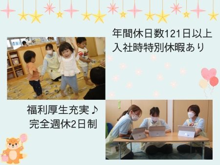 | 仕事内容 | 子どもたちの年齢や成長に応じた保育業務全般を行っていただきます。 ・着替え、食事の補助 ・保育環境の整備(主活動の準備、清掃等) ・保護者対応(連絡帳の作成等) ・帳票作成(日誌、行事計画等) ※持ち帰り仕事なし ※保育記録などはICTシステムを導入しており業務効率を図っています |