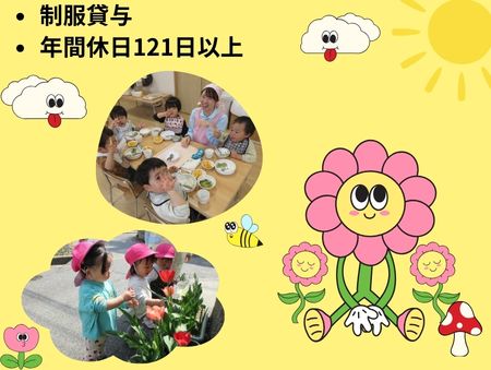 | 勤務時間 | 週3日以上/シフト制 【開園時間】 7:30~18:30(延長保育~19:30) 【シフト例】 (1) 7:30~14:30(実働6時間・休憩60分) (2) 8:00~15:00(実働6時間・休憩60分) (3)11:30~18:30(実働6時間・休憩60分) ※延長保育の場合は19:30までになります。 シフト制です。 週休2日制です。 1ヶ月の労働時間:70~80時間/月 |