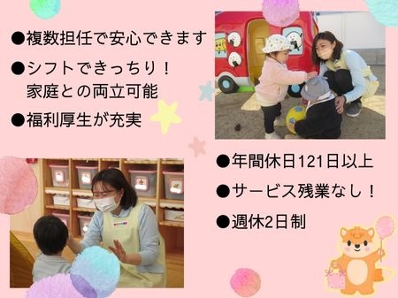 | 仕事内容 | 子どもたちの年齢や成長に応じた保育業務全般を行っていただきます。 OJT制度で成長できます! ・着替え、食事の補助 ・保育環境の整備(主活動の準備、清掃等) ・保護者対応(連絡帳の作成等) ・帳票作成(日誌、行事計画等) ※持ち帰り仕事なし ※保育記録などはICTシステムを導入しており業務効率を図っています |