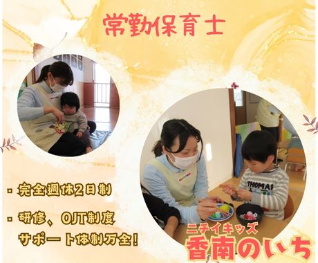 | 仕事内容 | 0歳から2歳児対象で定員19名の小規模保育園です。 子ども達の年齢や成長に応じた保育業務全般を行って頂きます。 ・授乳、おむつ交換 ・着替え、食事補助 ・保育環境の整備(主活動の準備、消毒・清掃等) ・保護者対応(連絡帳の作成等) ・帳票作成(日誌・行事計画等) ・ICTシステム導入で効率化 |