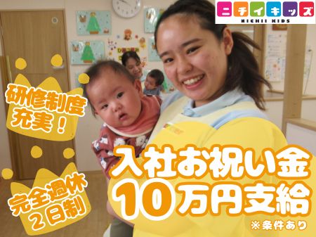 キャリアアップ研修(1科目以上)修了済みの方【入社お祝い金最大10万円!+完全週休2日制!】保育士資格を活かせる♪子ども一人一人と向き合って保育したい方にピッタリ♪ブランク・未経験の方の応募OK!経験のない方でも安心して働ける研修制度があります。