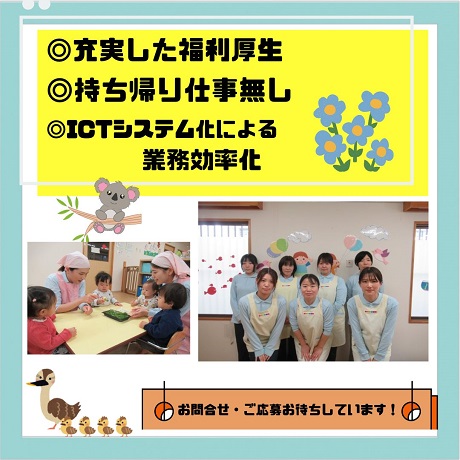 松江市の0歳児~2歳児、定員18名の企業主導型保育園です。完全週休2日制でプライベートな時間も大切にできます。
