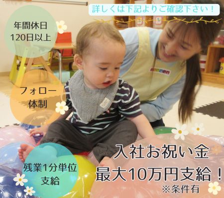 残業ほぼ無し!持ち帰り業務無し!完全週休2日制!研修制度、OJT制度あり!安心してお仕事が出来ます。*園見学、お気軽にお問合せ下さい!