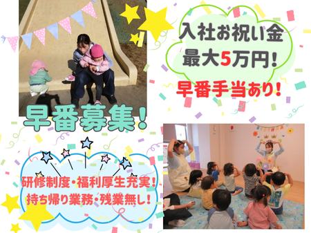 【早番専属のお仕事】駅近保育園で19名の少人数!!保育士資格が活かせる職場で一緒に働きましょう♪【入社祝い金有り】