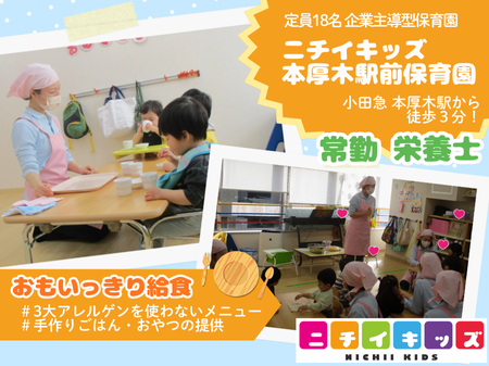 【こどもの食育活動に関わりたい方歓迎!!】【扶養内勤務可!】保育園でおやつ・お給食を作ってみませんか?三大アレルギーを使わない食育活動をしております!