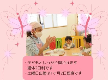日曜・祝日がお休みのお仕事です!! 小規模保育園なので、少人数での保育が可能です。