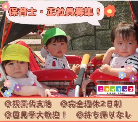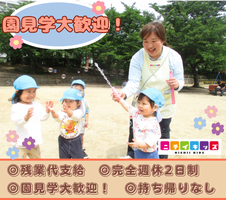 残業ほぼ無し!持ち帰り業務無し!完全週休2日制!研修制度、OJT制度あり!安心してお仕事が出来ます。*園見学、お気軽にお問合せ下さい!