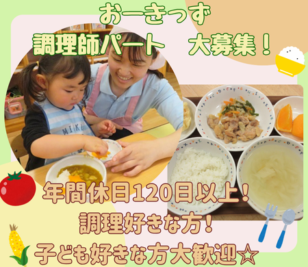【パート調理師】2026年3月以降勤務開始! 0~2歳児の子ども達に美味しい給食をつくって、笑顔をつくるお仕事です♪日曜は休園日/園見学可
