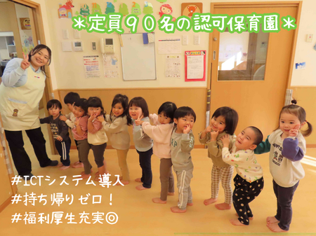 0歳児~就学前までの60名定員の認可保育園です。OJT制度があり、安心して働く事ができます!