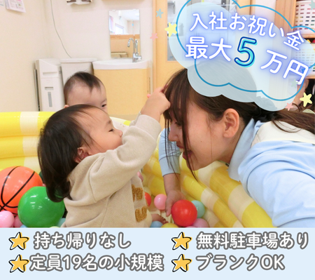 【入社お祝い金最大5万円】定員18名の保育園です。遅番勤務可能な方。小規模の良さを活かし丁寧な保育、個々に合った保育を保育をしています。