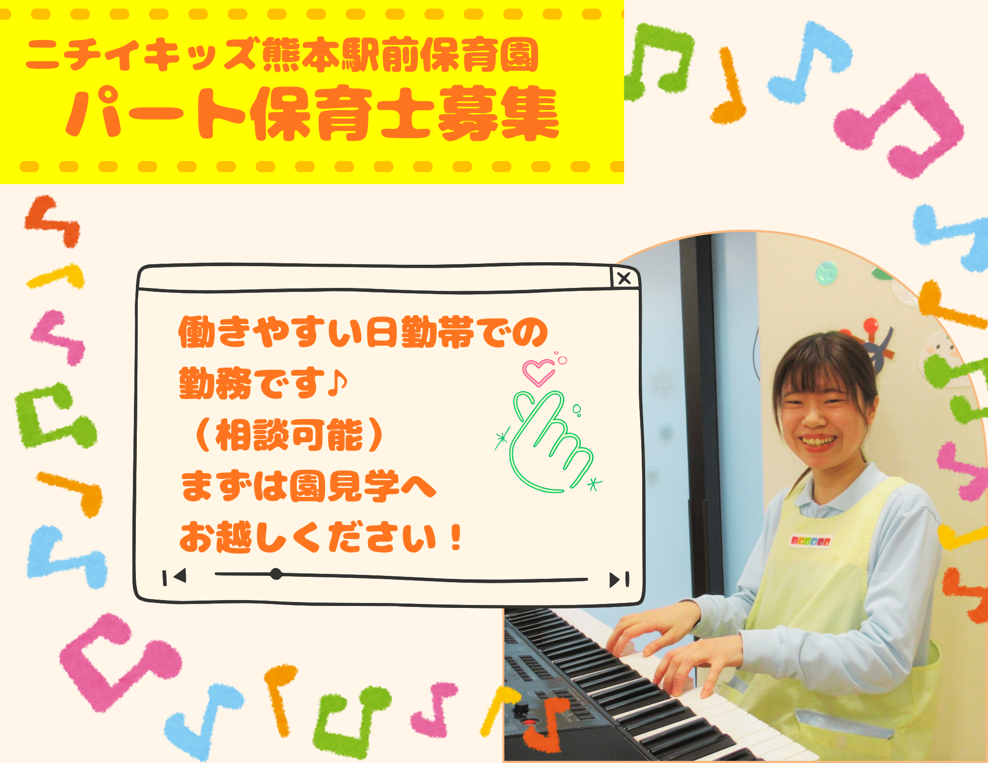 【パート】保育士募集 ★11時~15時勤務★0~2歳児対象、定員19名の保育園 駅近 アミュプラザくまもと近く 残業ほぼ無し 持ち帰りの業務無し